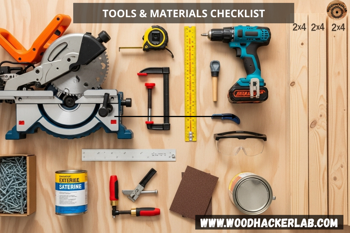 - Lumber: (6) pieces of 8-foot 2×4 boards. Standard 2x4s are easy to work and cost-effective.