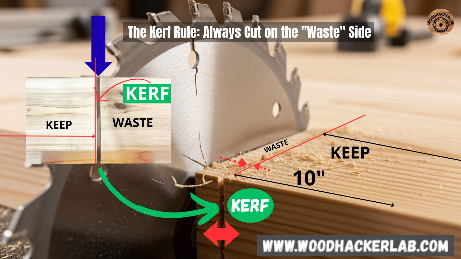 The Kerf Rule: The "kerf" is the width of the cut made by your saw blade. This means the line you mark is not the line your workpiece will be after the cut. Always cut on the "waste" side of your line. Forgetting the kerf is a classic beginner mistake that results in pieces that are 1/8" too short.